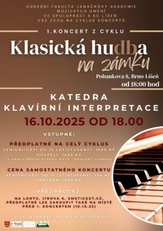 Studenti Hudební fakulty JAMU ve spolupráci s Kulturním centrem Líšeň vás zvou na 1. koncert z cyklu Klasická hudba na zámku v sezóně 2025/2026.