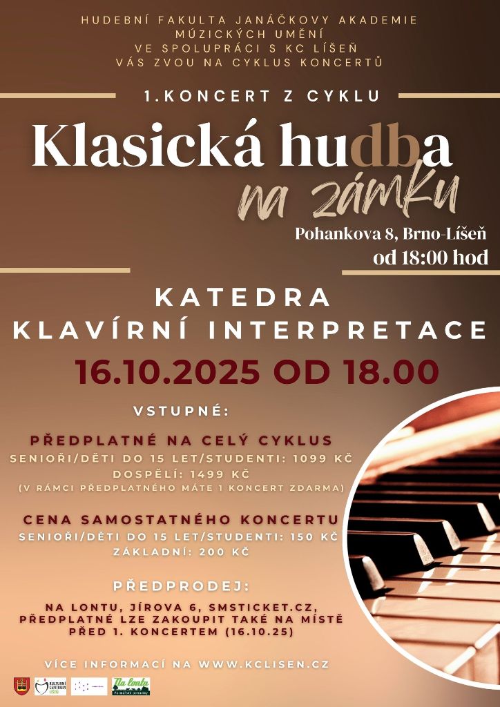 Studenti Hudební fakulty JAMU ve spolupráci s Kulturním centrem Líšeň vás zvou na 1. koncert z cyklu Klasická hudba na zámku v sezóně 2025 – 2026.