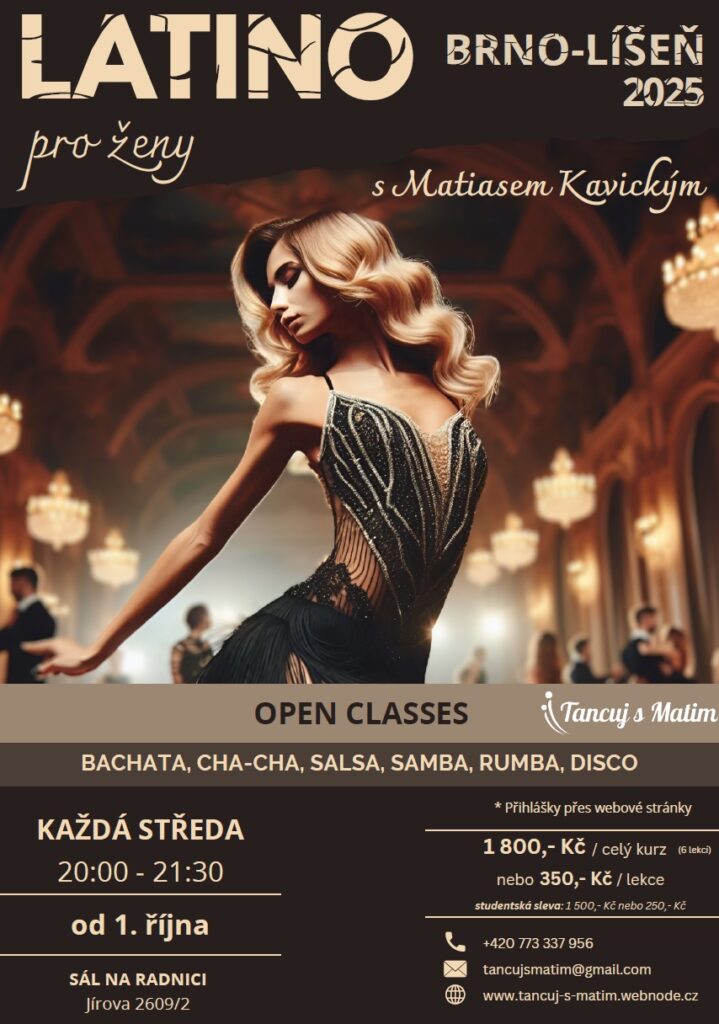 Taneční kurzy pro dospělé Místo konání: sál radnice Jírova 2, 628 00 Brno-Líšeň. STŘEDA Latino pro ženyStředa 20:00 – 21:30 od 1. 10. 2025Sál radnice Jírova 2, 628 00 BrnoPořadatel Matias KavickýTelefon: 737 337 956, e-mail: tancujsmatim@gmail.comweb: www.tancuj-s-matim.webnode.cz